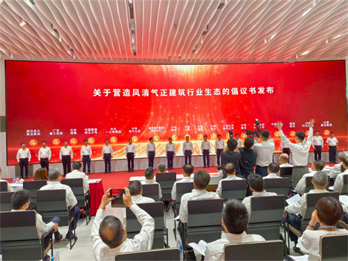 會議播放了建筑行業(yè)發(fā)展成果視頻《基石之力筑夢中國式現(xiàn)代化》;中國建筑董事長、黨組書記鄭學(xué)選進行了主旨發(fā)言;倡議發(fā)起單位代表中鐵二局黨委副書記、總經(jīng)理張兵,中核集團副總工程師、中國核建黨委書記、董事長陳寶珠,上海建工集團黨委副書記、工會主席殷紅霞,濰坊昌大建設(shè)集團董事長徐鵬強分別進行了表態(tài)發(fā)言;中建一局黨委書記、董事長左強代表建筑企業(yè)宣讀了倡議書,中建二局、中國核建、中機建設(shè)、中國中冶、通用技術(shù)集團新興公司、中國化學(xué)國際公司、中鐵電氣化局、中鐵建設(shè)、中交一公局集團、中國電建水電七局、中國能建浙江火電、中國安能一局、北京城建、隧道股份、廣東建工控股、山東科達集團、濰坊昌大建設(shè)集團、興泰建設(shè)集團領(lǐng)導(dǎo),共同按壓大屏手印圖案,聯(lián)合發(fā)布了《關(guān)于號召建筑行業(yè)黨組織和廣大黨員在營造風清氣正行業(yè)環(huán)境中走在前作表率的倡議書》。